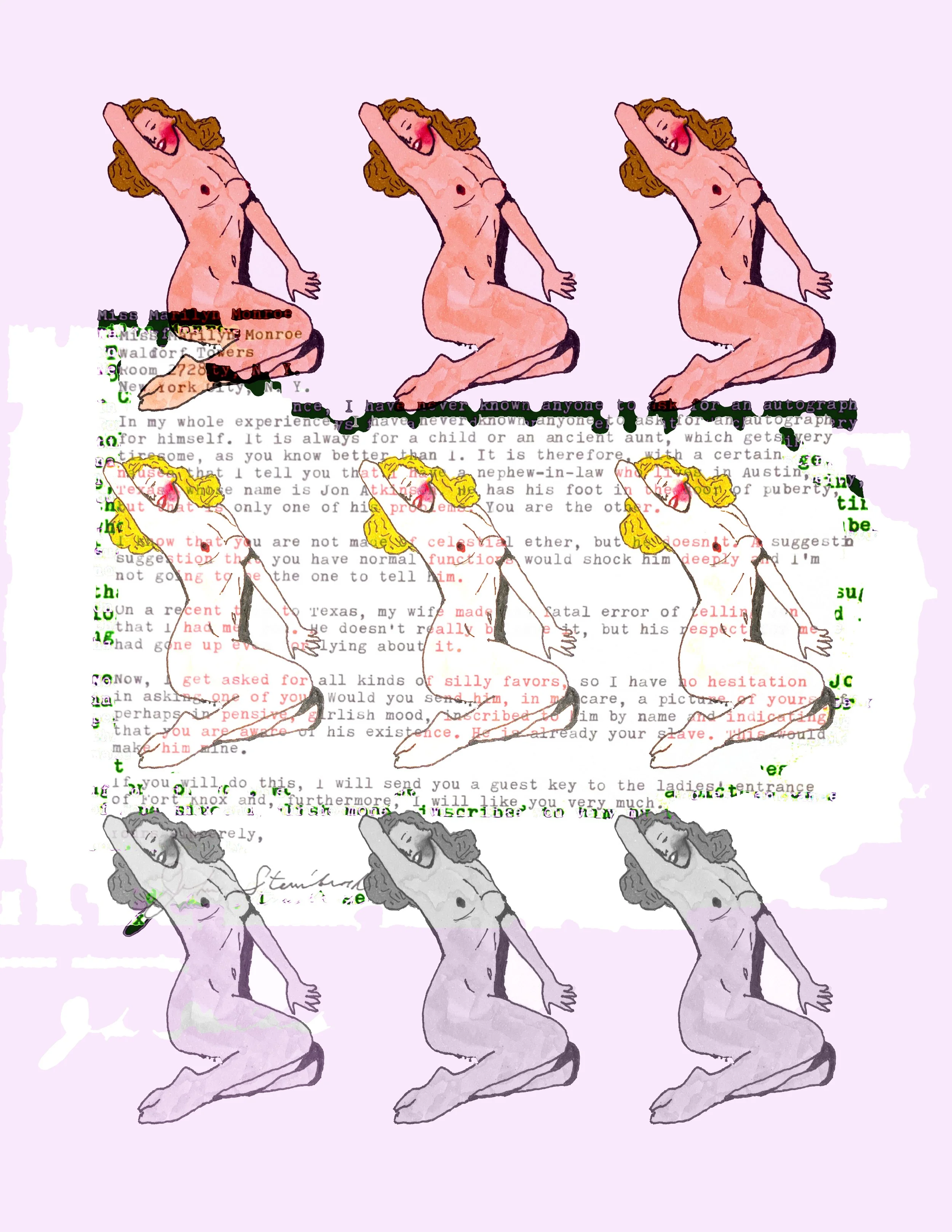 In 1955, John Steinbeck wrote a letter to Marilyn Monroe requesting Monroe to send a personal photo to his Marilyn-obsessed nephew, Jon Atkinson. The authenticity of the letter is now being questioned. “Marilyn Steinbeck” combines Steinbeck’s (questionable) letter with Monroe’s scandalous (iconic) Playboy debut photograph.